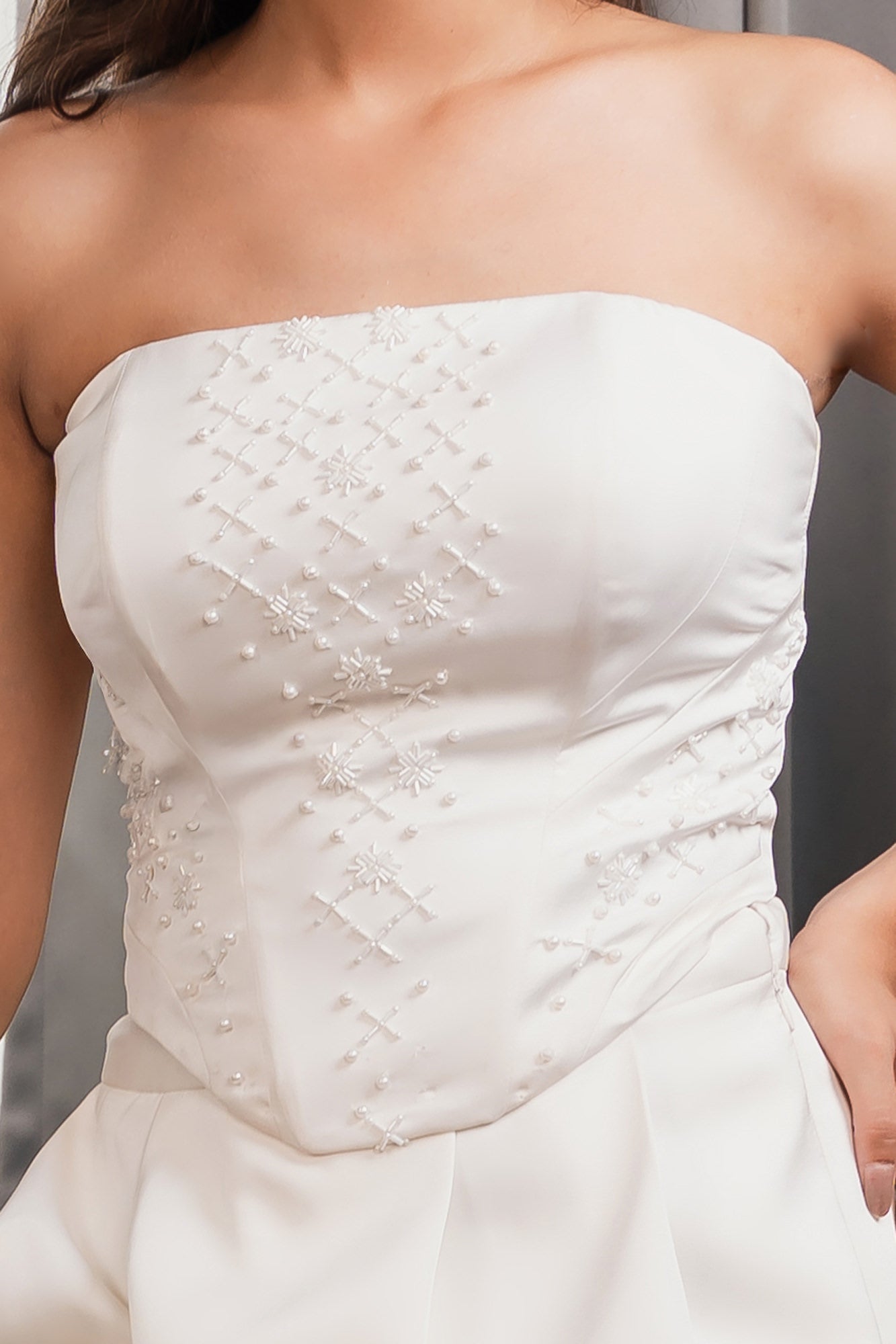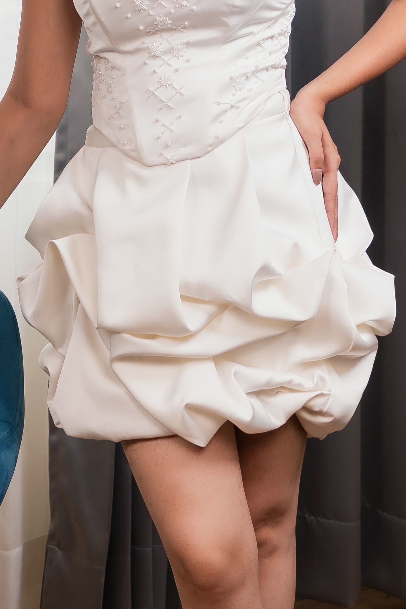 A stunning couture corset top crafted in rich satin, intricately hand-embroidered with delicate pearls. Designed for statement-making evenings, the structured silhouette sculpts the body beautifully while exuding elegance. A voluminous satin bubble skirt that floats with grace.