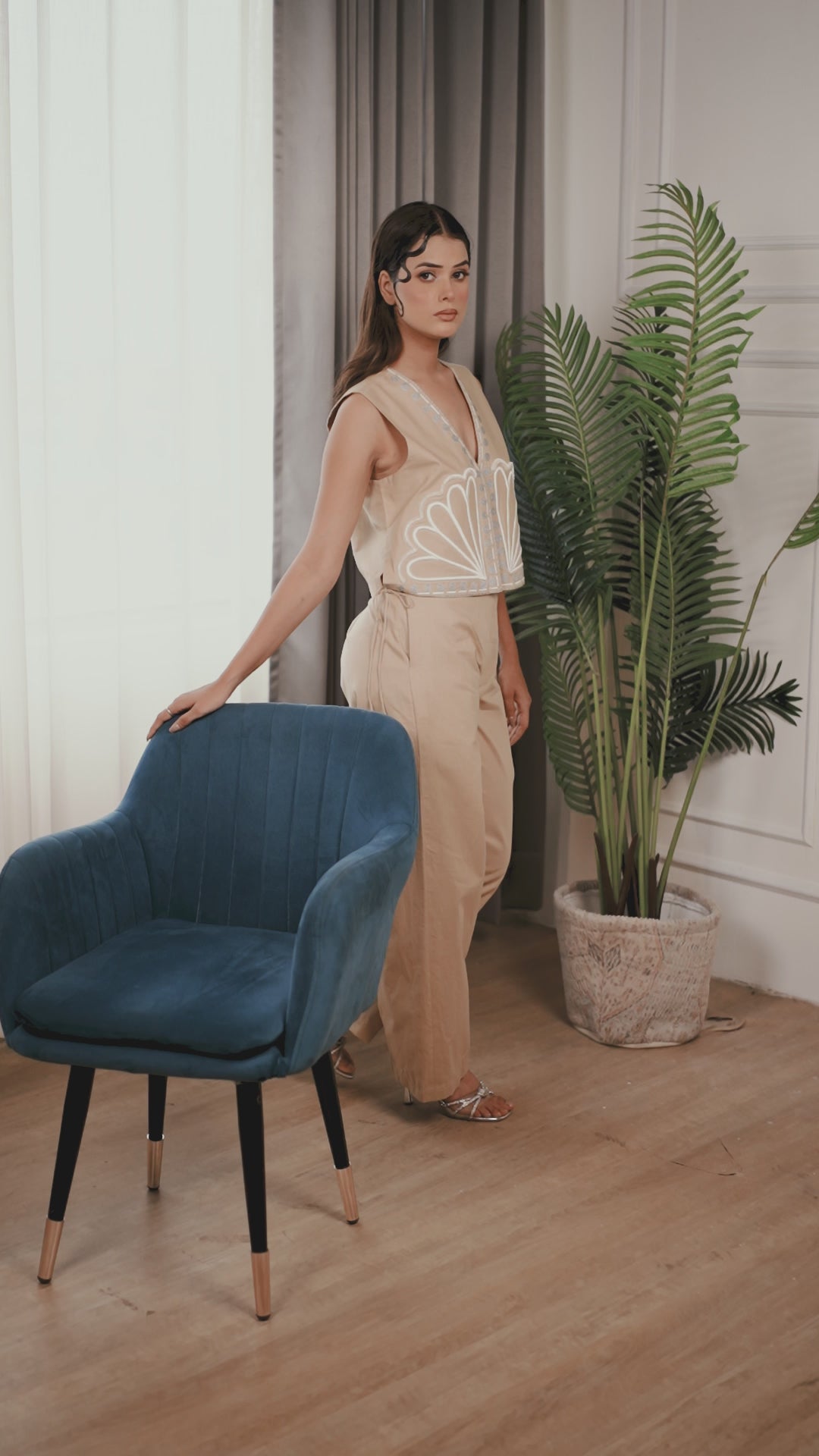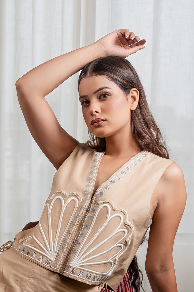 A refined beige corset with short length, featuring intricate epaulette embroidery in white and dreamy spiral blue patterns. Structured and elegant, it pairs contemporary tailoring with artistic detail.