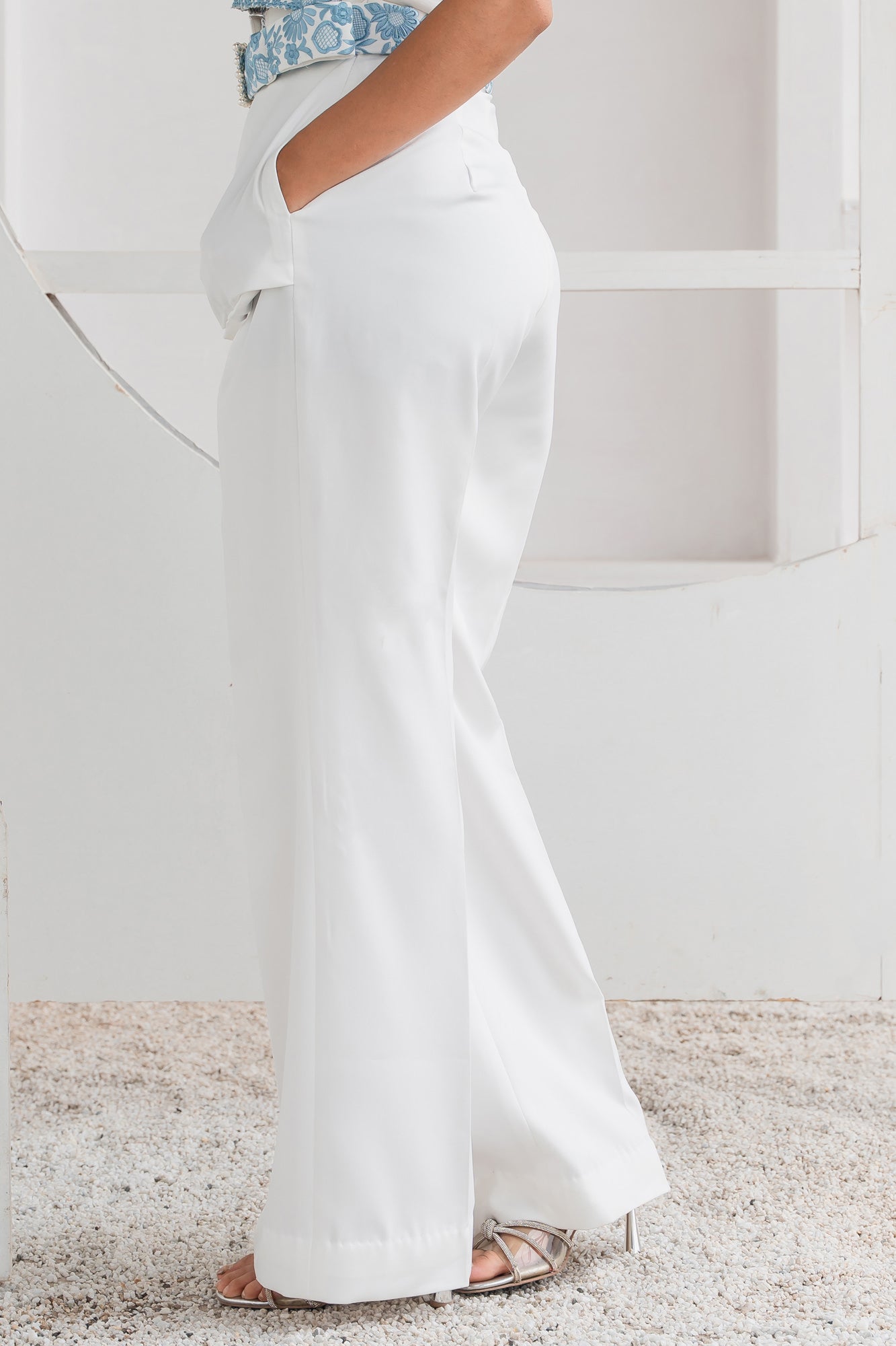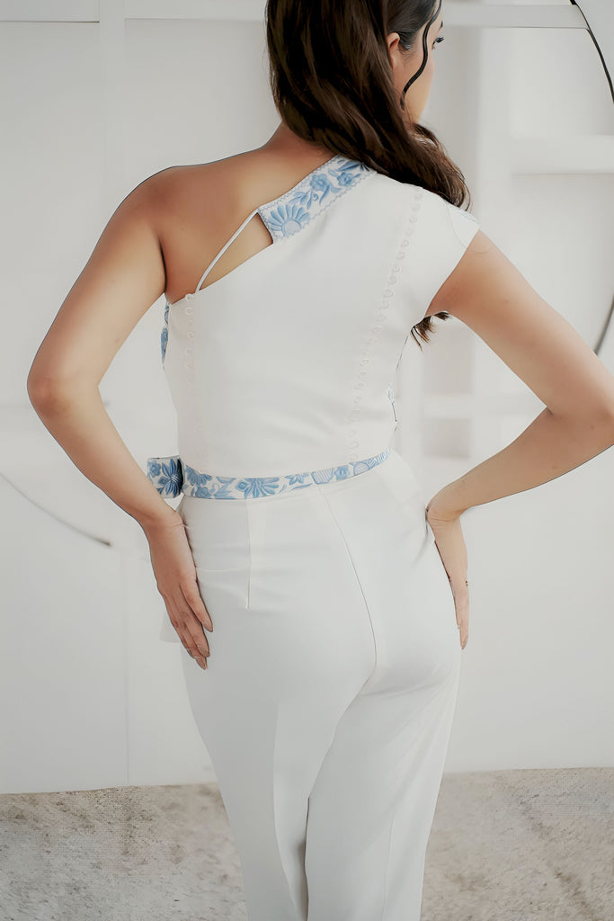 Sculpted to perfection, this elegant white corset top features graceful blue embroidery with a structured finish. Its floral-inspired design flatters the form while keeping things bold and chic.