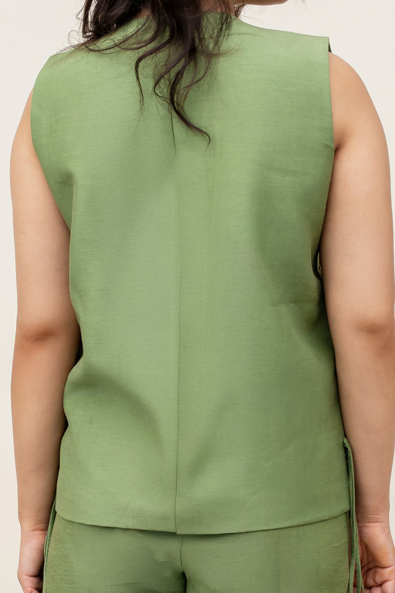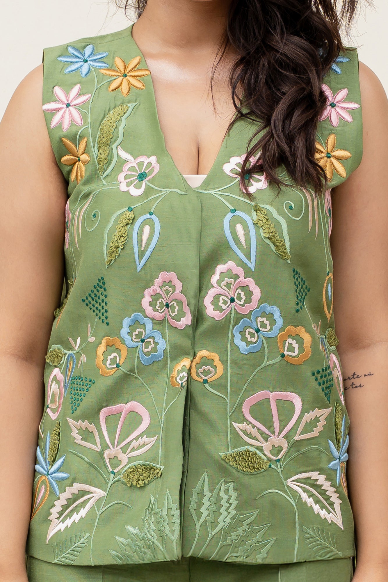 A fresh green linen top highlighted by vivid multicolor embroidery. Lightweight and breathable, this piece brings joyful artistry to summer styling.