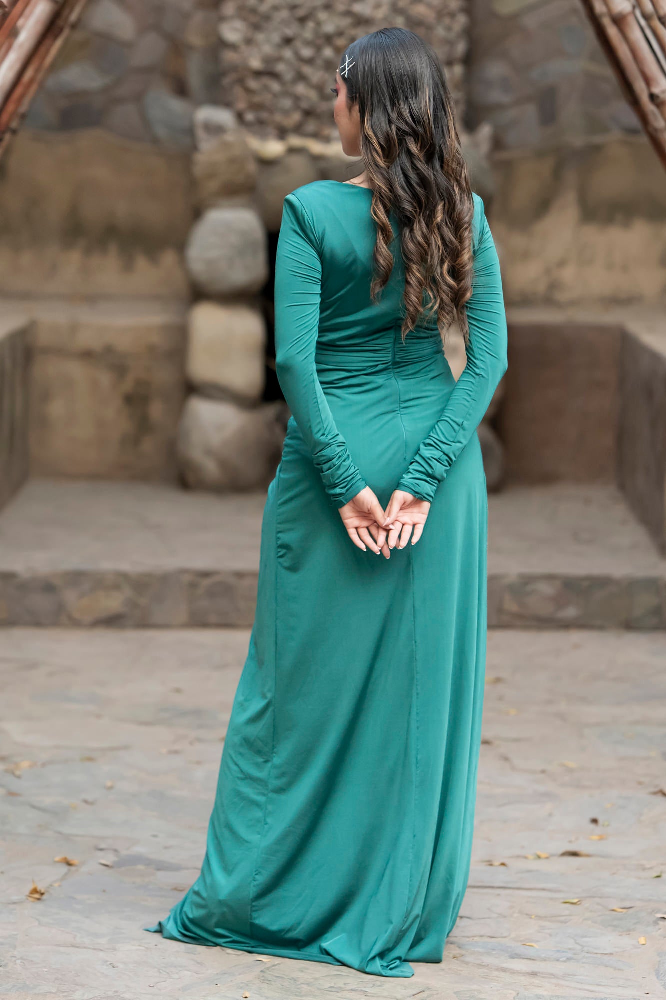 A cascading three-tier silhouette in a deep forest green, this dress is a nod to classic femininity and graceful movement. Perfect for events that require a soft yet striking statement.