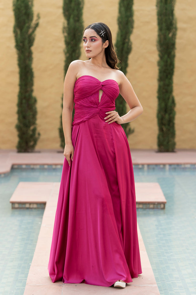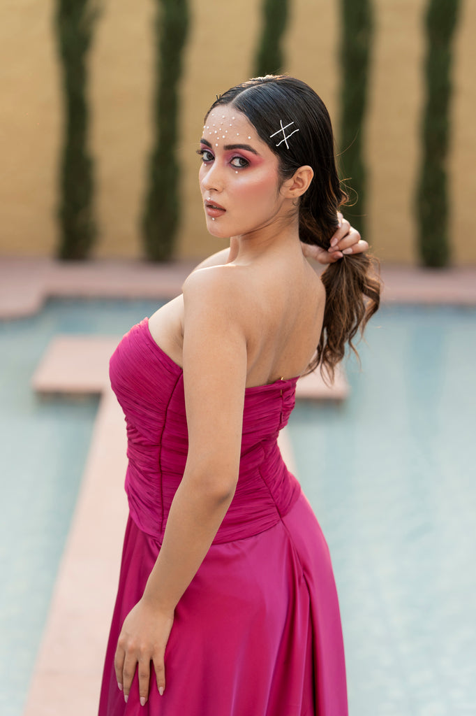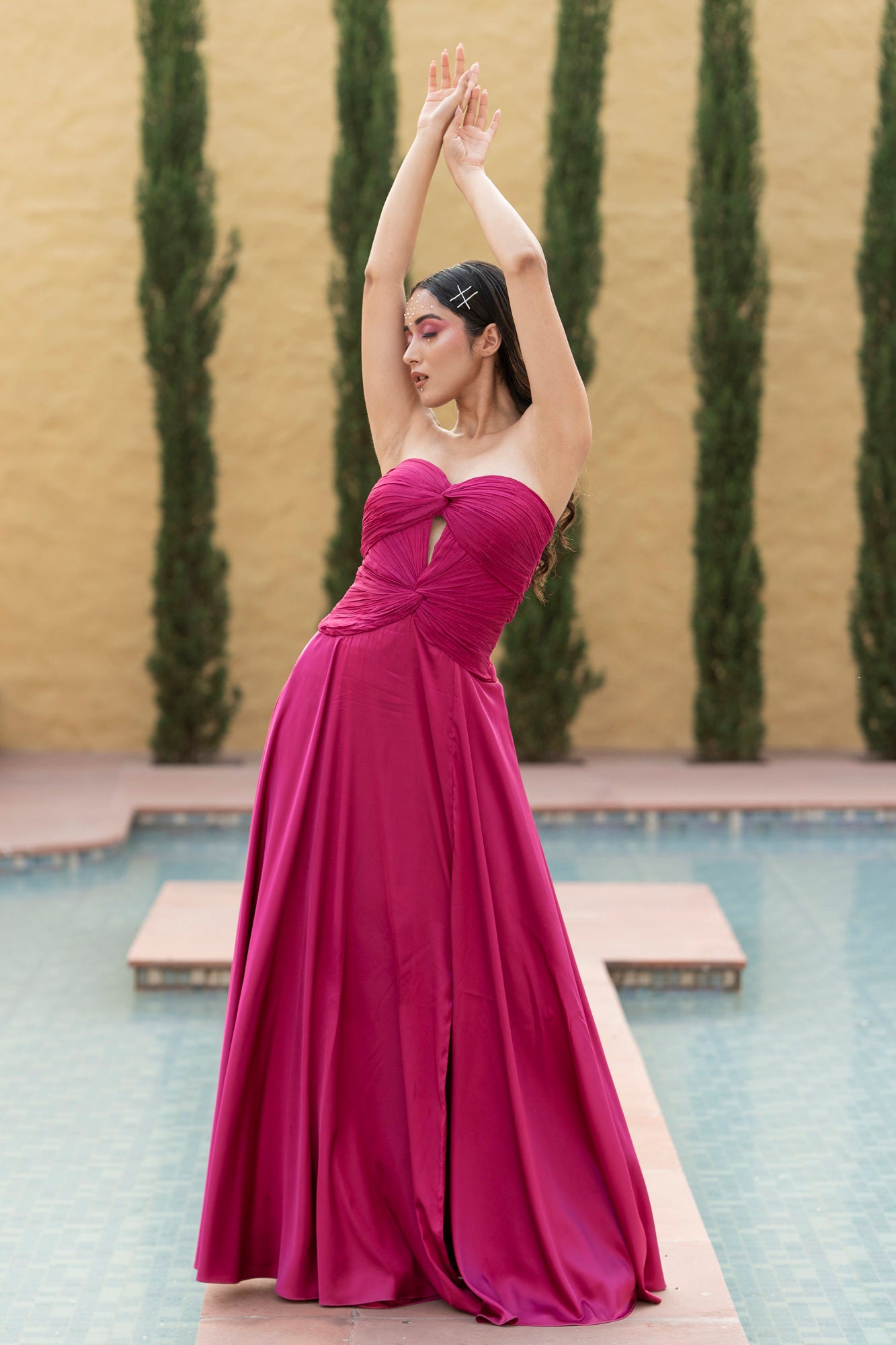 Two tiers of dreamy draping and a pleated bustier come together in this couture-inspired silhouette. Feminine, statuesque, and timeless.