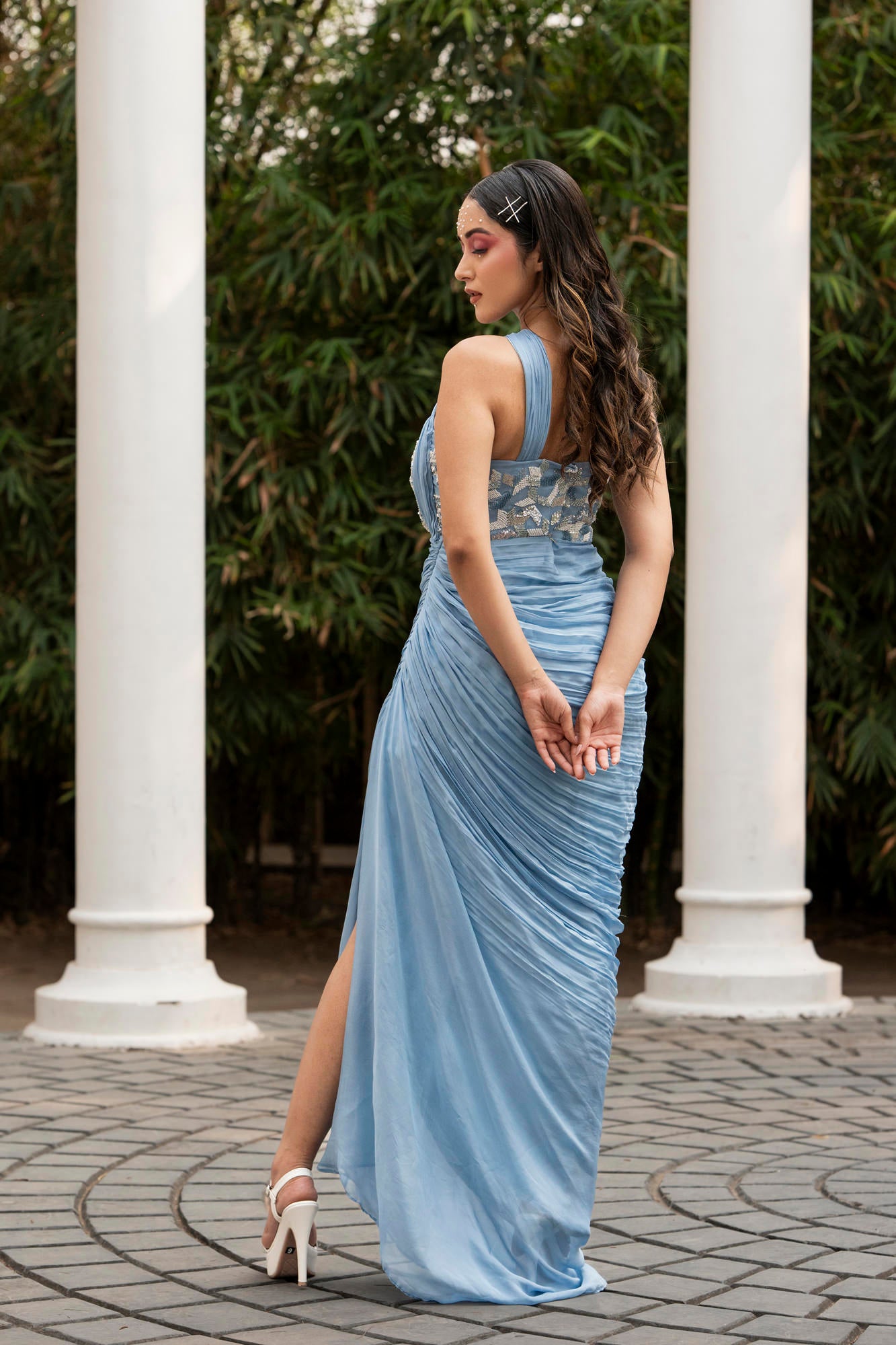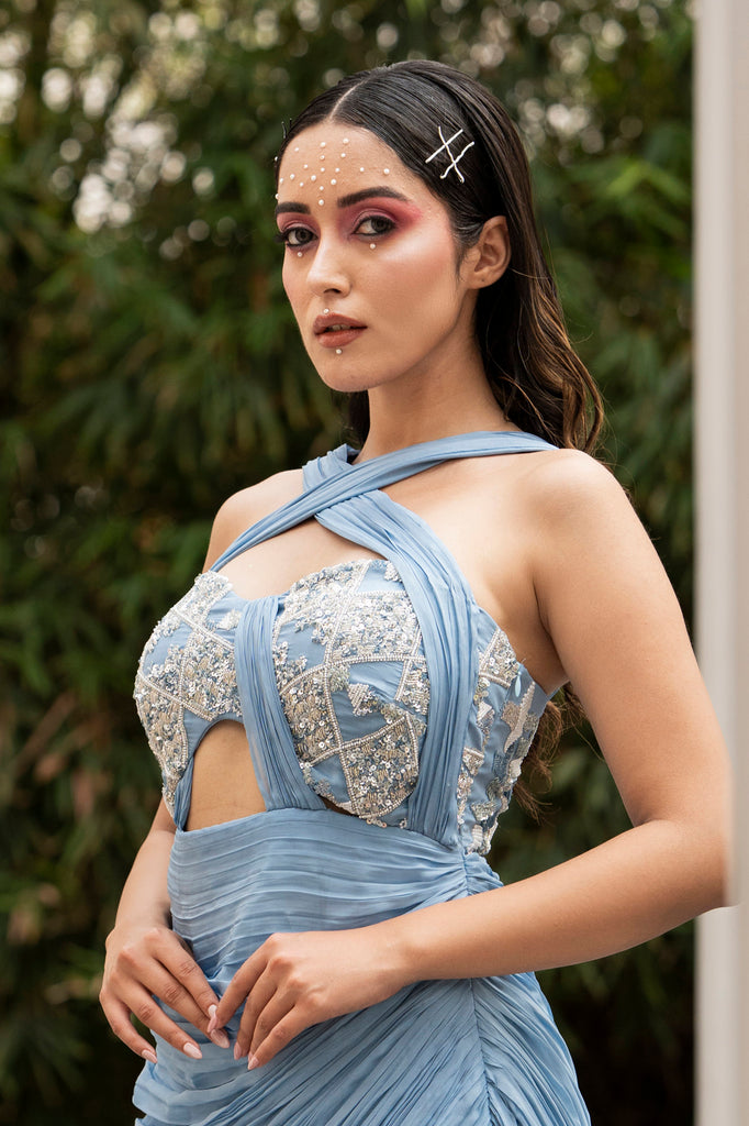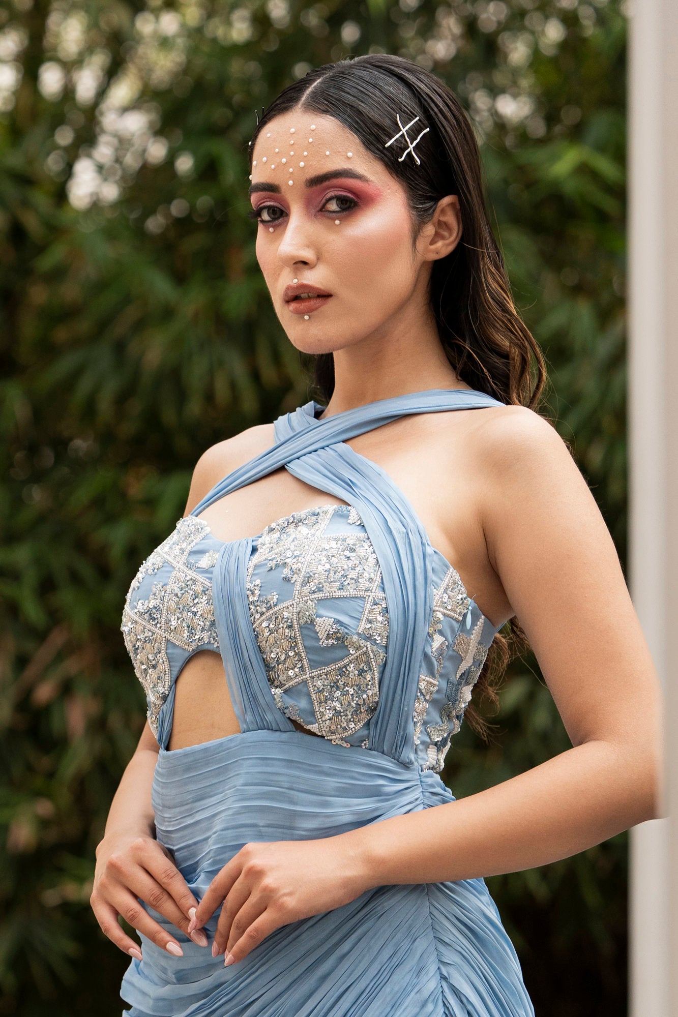 Delicately embroidered and softly draped, this powder blue dress brings ethereal elegance to life. A refined choice for formal occasions or dreamy evenings.