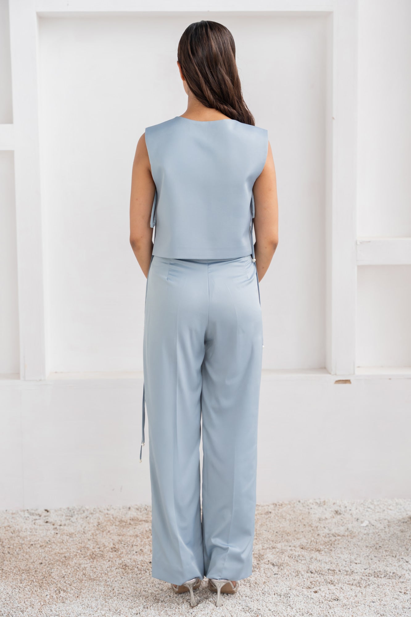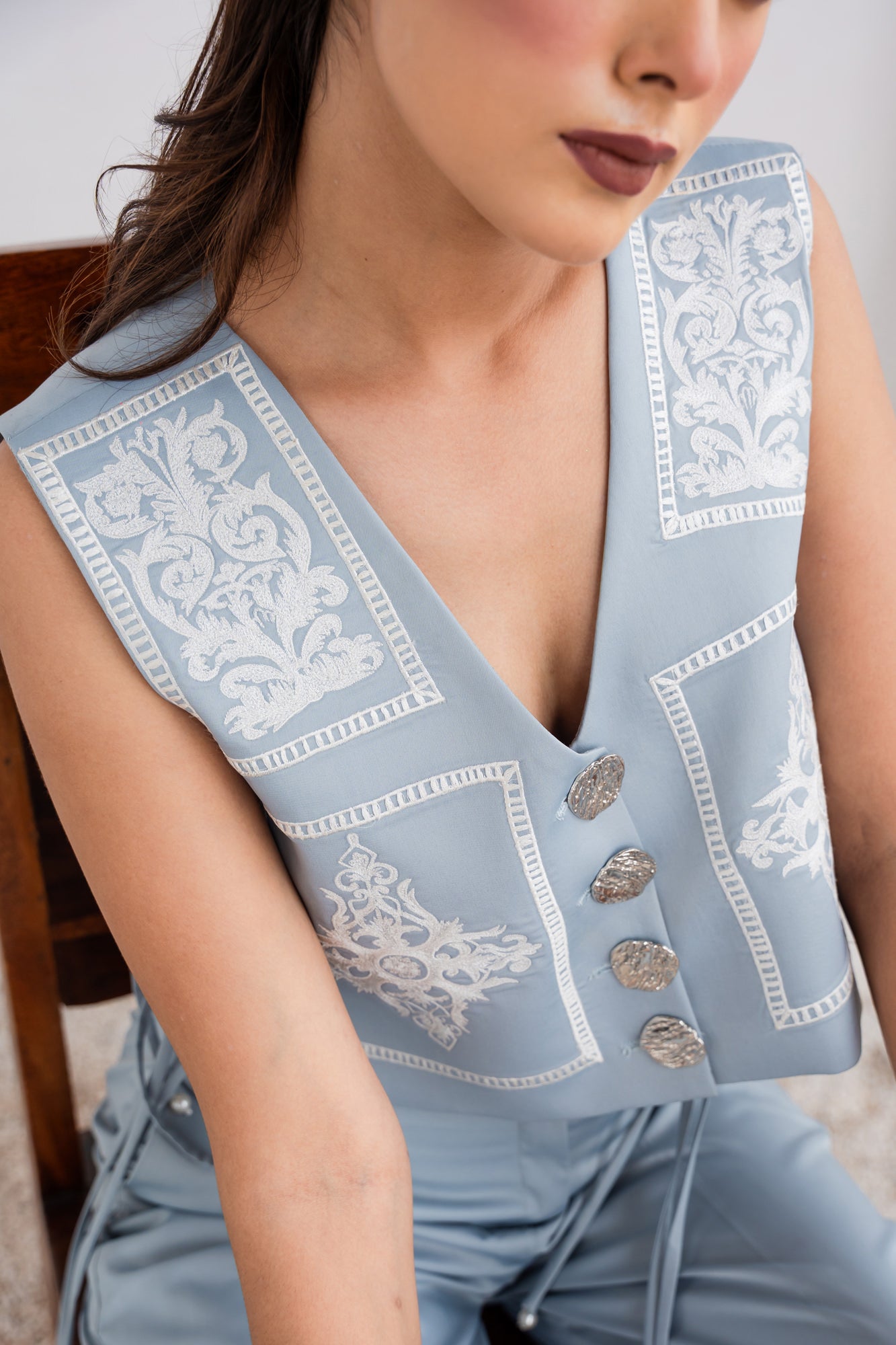 A cropped powder blue jacket adorned with intricate, white-toned thread embroidery, has elegant side stipes to tie. Lightweight and sharp, it blends playful charm with delicate craftsmanship — ideal for modern elegance.