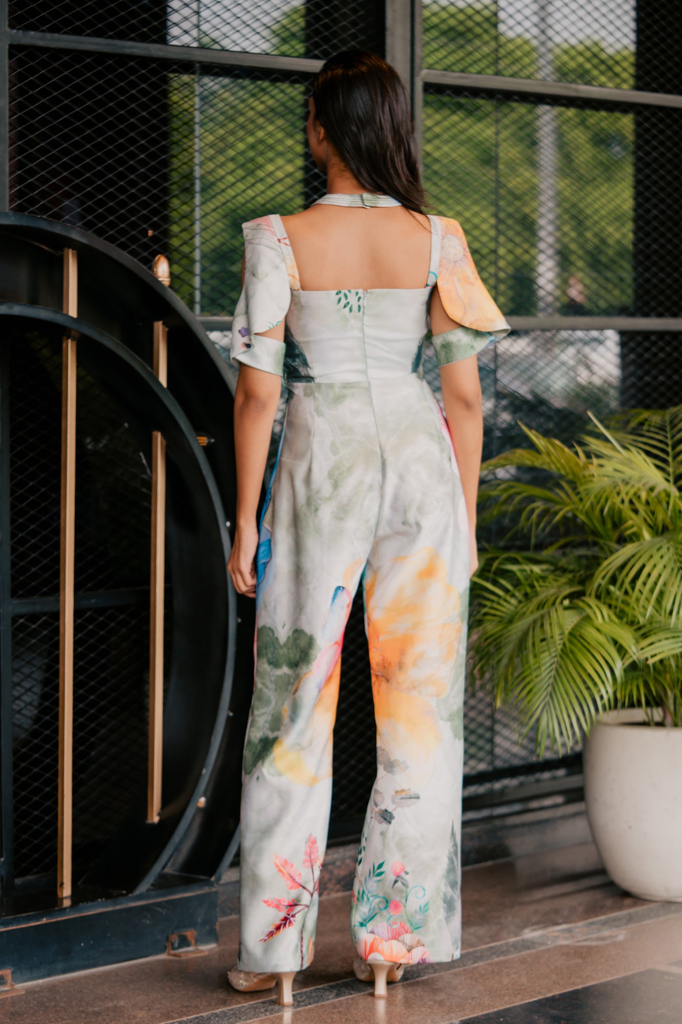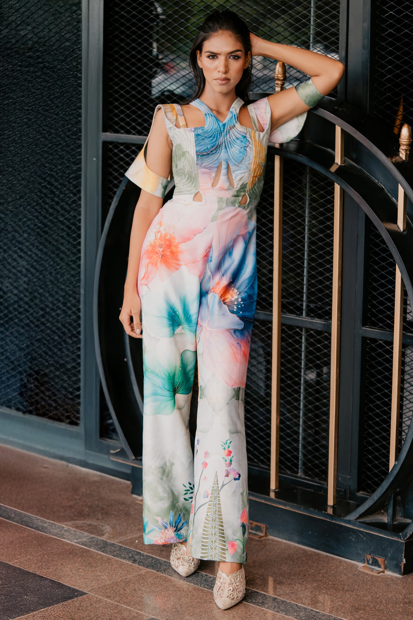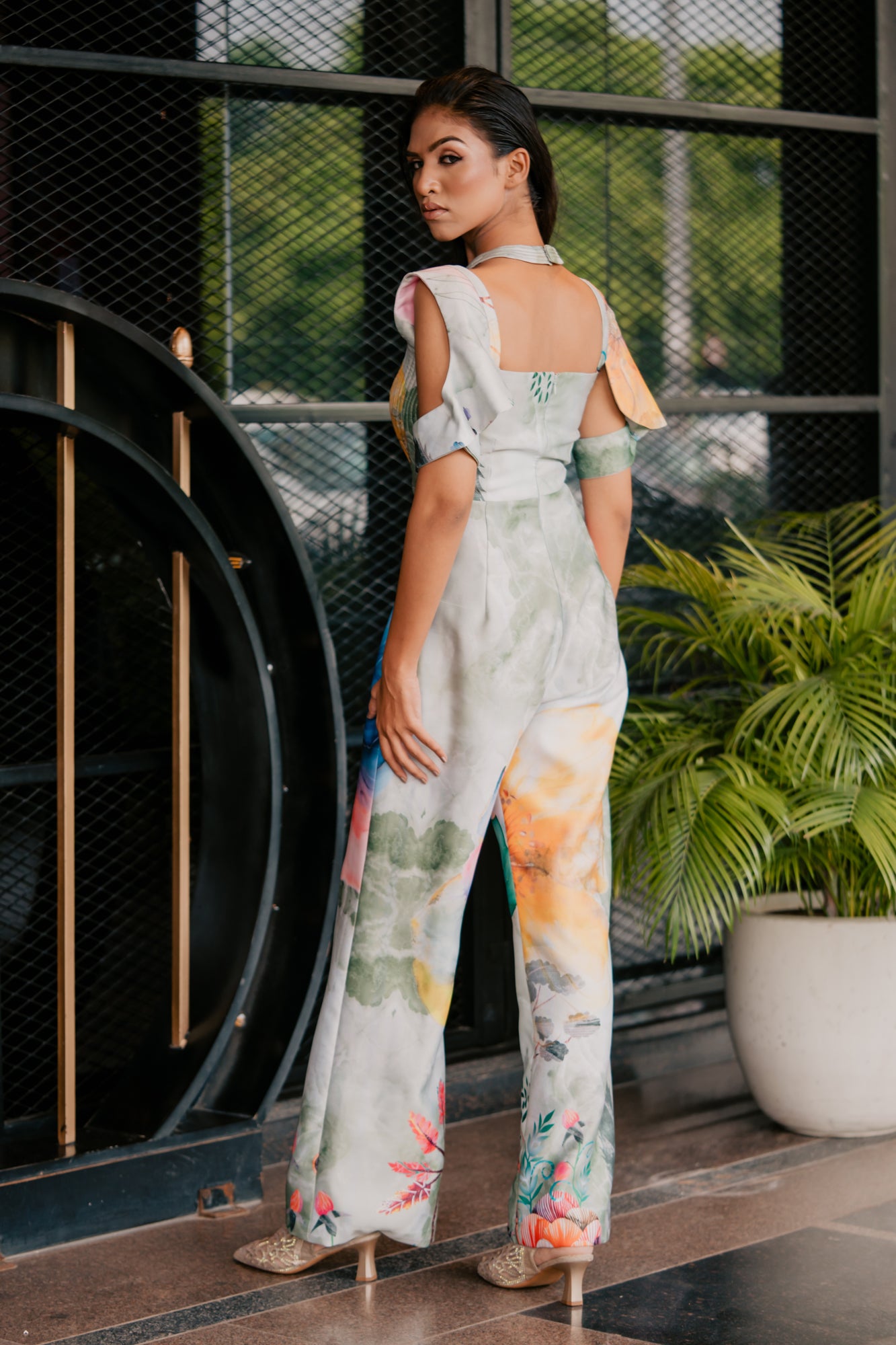 This white jumpsuit with floral print and quilted corset detail embodies couture sophistication. Perfect as a modern Indo-Western jumpsuit and a chic evening wear option.