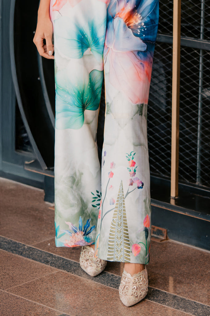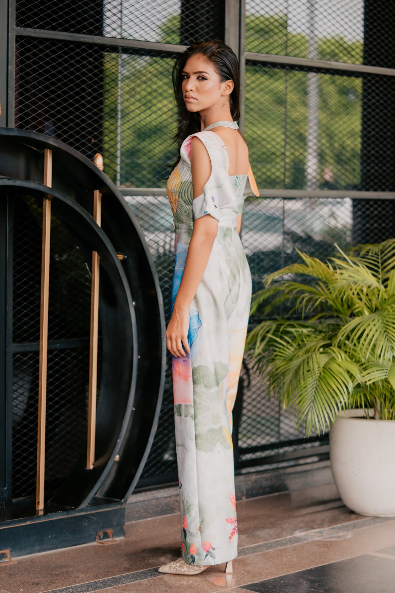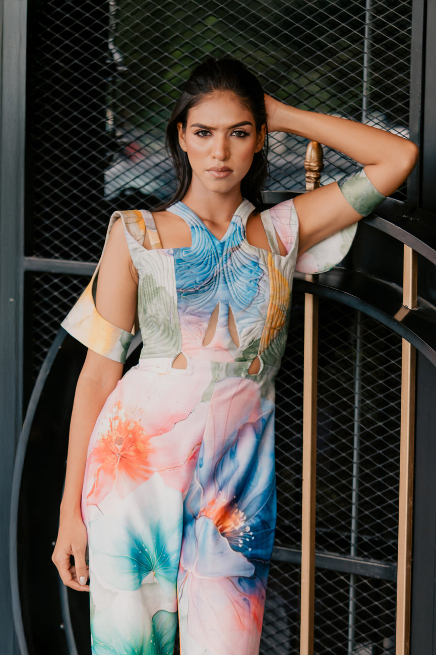 This white jumpsuit with floral print and quilted corset detail embodies couture sophistication. Perfect as a modern Indo-Western jumpsuit and a chic evening wear option.