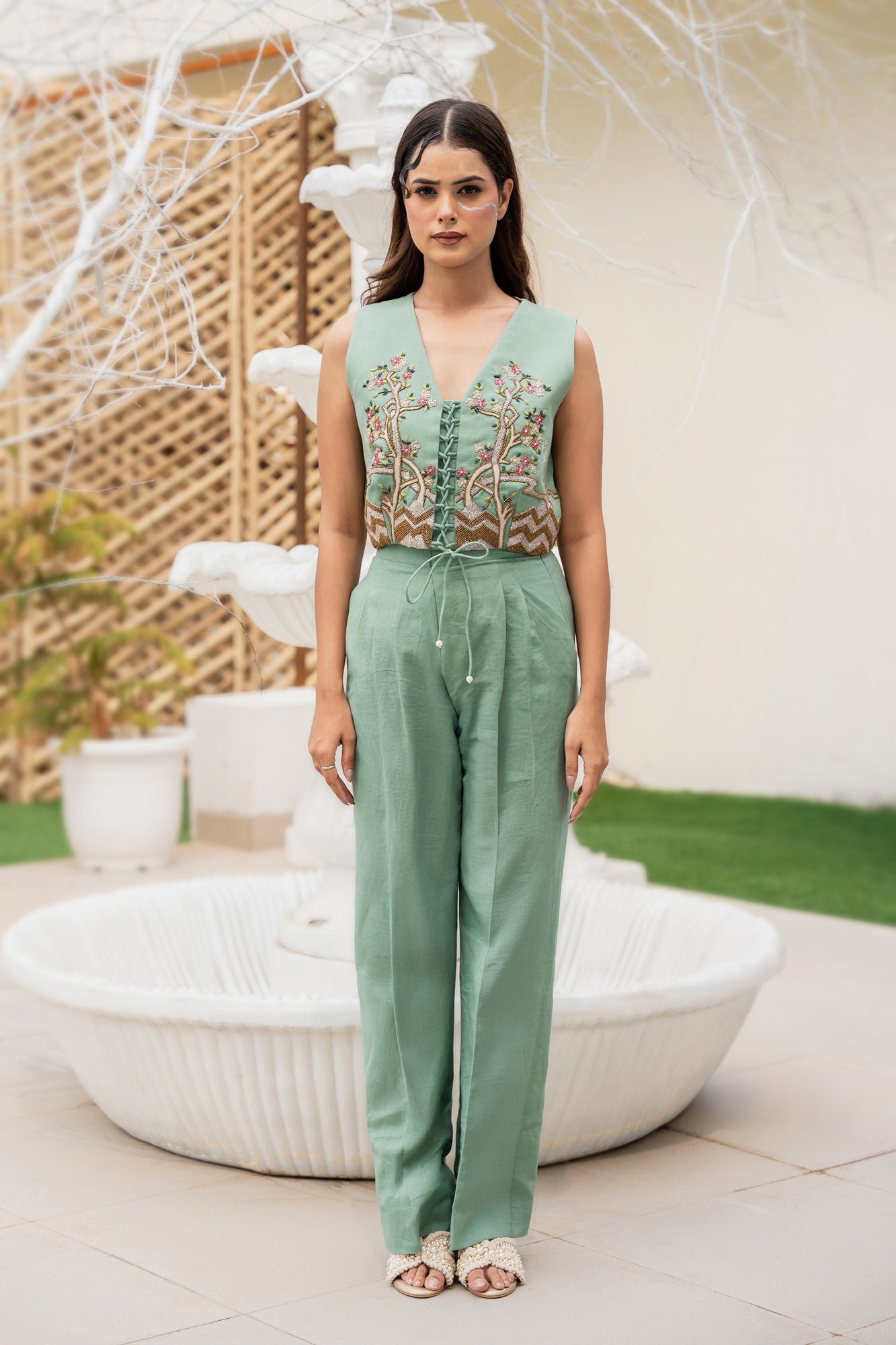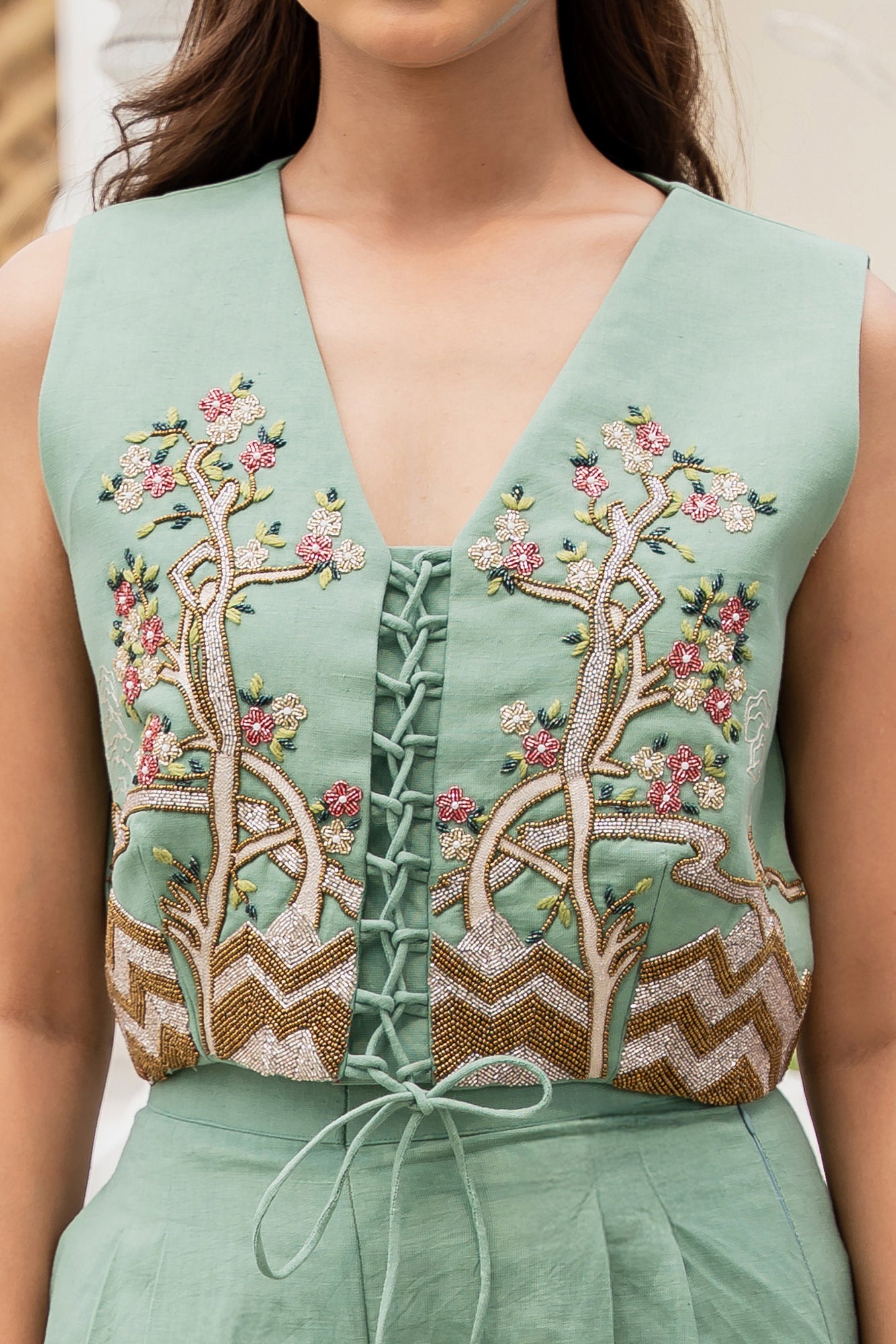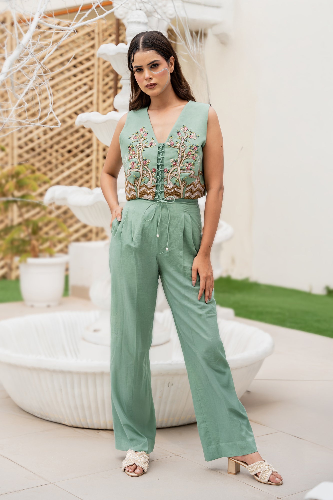 A beautifully embroidered dull green jacket featuring intricate hand-beaded and pre-embroidered detailing. Subtle yet rich in texture — ideal for elevated daywear.