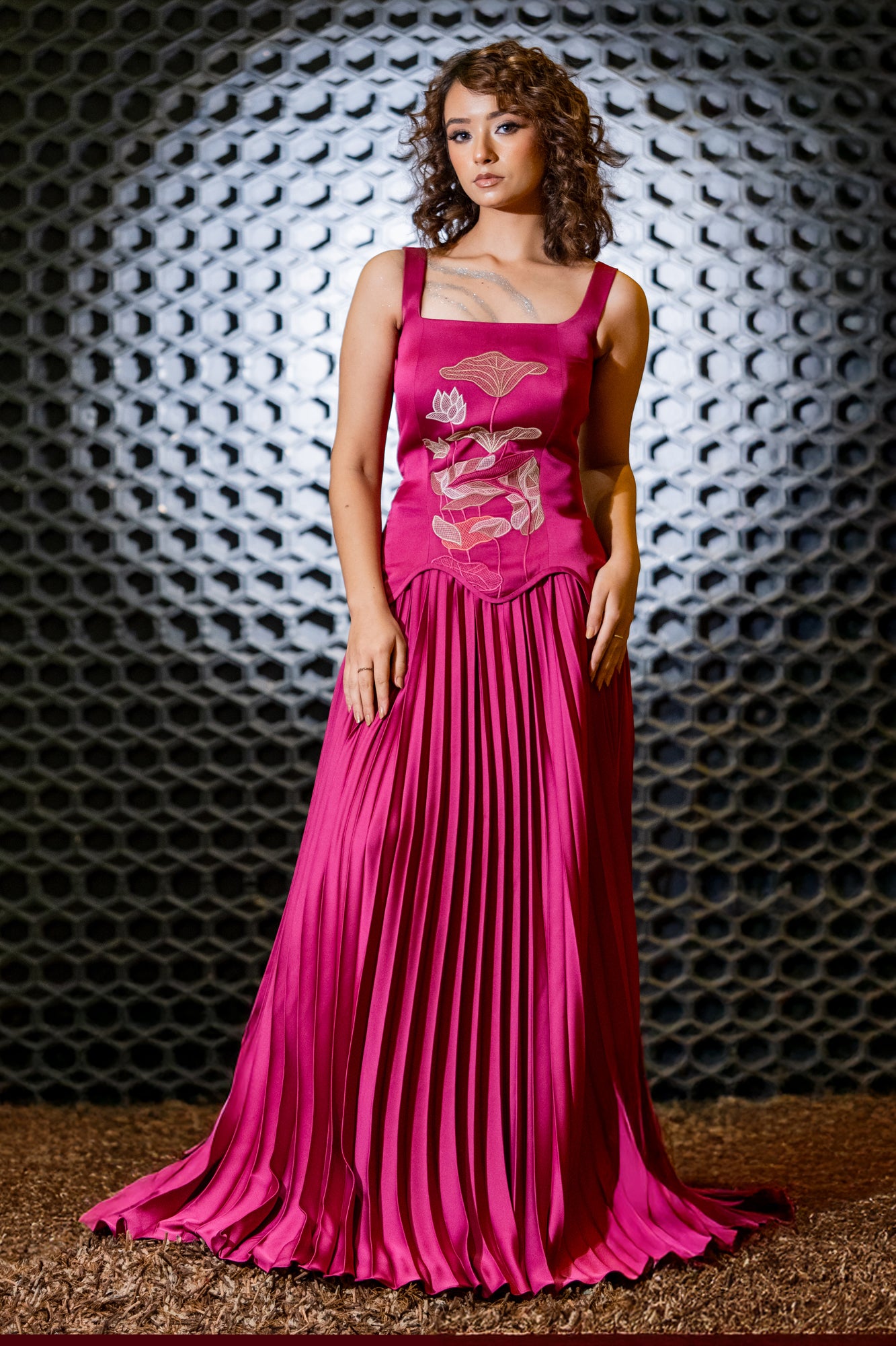 This pink couture corset gown shimmers with embroidery, paired with a pleated skirt. An Indo-Western gown that blends femininity with refined party wear style.